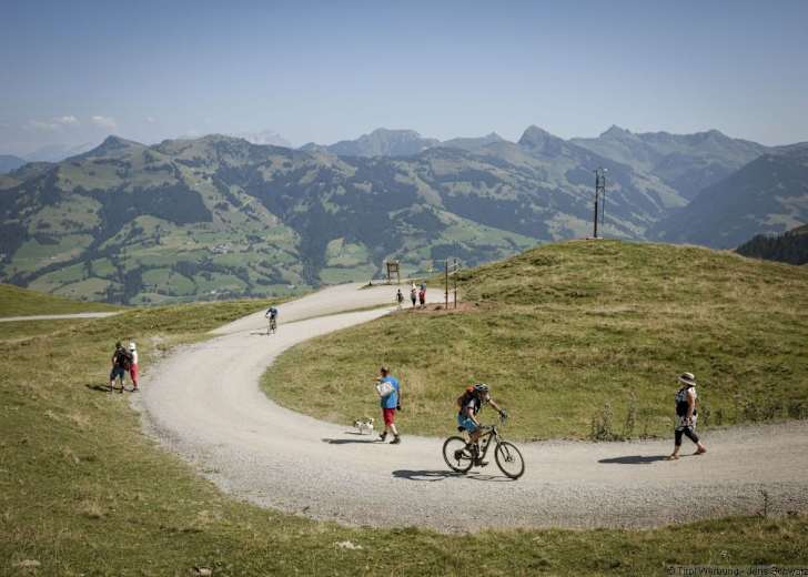 Über die bekannteste Skipiste der Welt: eine abwechslungsreiche MTB-Tour führt von Kitzbühel auf den Hahnenkamm und weiter zum Pengelstein auf 1.928 m. Das Restaurant Hochkitzbühel bietet sich für eine Stärkung und zum Genießen des 360-Grad-Panoramas an.