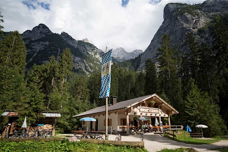 Nach der Brücke an der Lenz'nhütte rechts fahren, es folgt eine starke Steigung bis zur Partnachalm. Auf 983 m können Durstige und Hungrige die erste Rast einlegen. Weiter an der Partnachalm vorbei fahren und der Strecke Richtung Bockhütte folgen, ein kurzer Stopp auf der Brücke vor der Hütte ist ein Muss. Fasziniert von der atemberaubenden Umgebung des Wettersteingebirges ist man dem Ziel schon sehr nahe. An der Bockhütte kann man sich dann mit einem erfrischenden Getränk auf der großen Terasse belohnen.