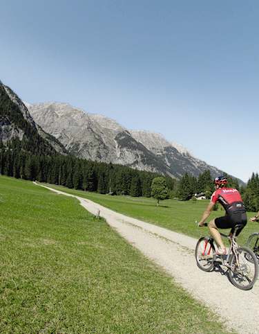 Auf vereinzelt steilen Passagen geht es auf dem Mountainbike durch das idyllische Fludertal und das Wettersteingebirge in der Olympiaregion Seefeld in Tirol. Belohnt wird das Brennen in den Wadeln vom Katzenkopf aus mit einem überwältigendem Blick auf die Tiroler Bergwelt.