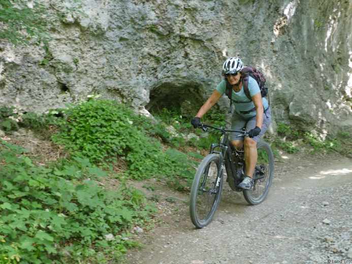 Im Steinbruch in der Mühlauer Klamm wurde schon im Mittelalter die Höttinger Brekzie abgebaut. Heute erkennt man den verlassenen Bergbaustollen an einem in den Fels gebauten alten Holzhäuschen. Der Adolf-Pichler-Weg führt direkt daran vorbei und anschließen in einem kurzen und schweißtreibenden Anstieg bis zum Rechenhof hinauf. Der atemberaubende Blick auf die Serles lassen die schweren Beine aber schnell vergessen. Die Tour ist offiziell als MTB-Route 598 - Adolf Pichler Weg (Rum) markiert.