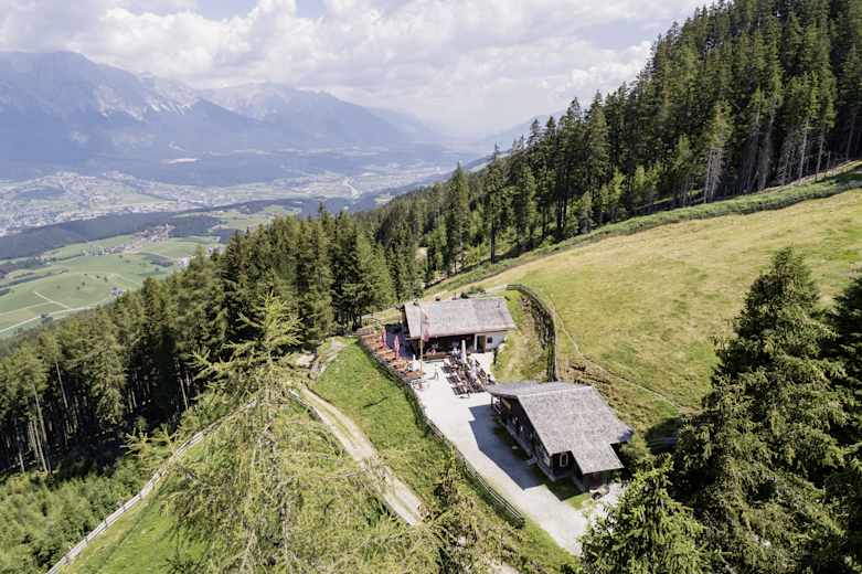 Die Aldranser Alm (1.511 m) verdient definitiv einen Besuch: Ohne Ruhetag serviert sie von Tiroler Gröstl bis Kasspatzln die komplette Palette der Tiroler Hausmannskost. Zusätzlich werden auch die Veganer mit Pikantem und Süßem versorgt. Das selbst gebackene Brot sollte man ebenfalls nicht auslassen.