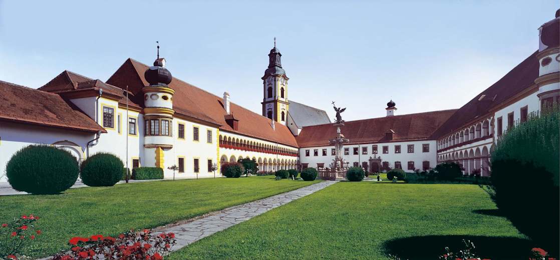 In Schärding fährt man beim Wassertor links und passiert das Passauertor. Weiter geht es wieder links zur Schiffsanlegestelle, wo man wieder auf den Radweg kommt. Es folgt die Querung der Prambrücke und einer kleinen Holzbrücke über den Doblbach. Schon bald rückt das Kloster Vornbach auf der anderen Seite des Flusses ins Blickfeld. Darunter fließt der Inn am Johannisfelsen vorbei. Im Wald erhebt sich die Neuburg mit ihren fünf Türmen.