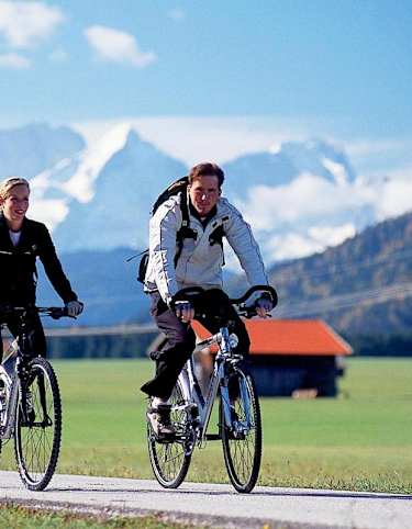 Zunächst leicht ansteigend zur Talstation der Ehrwalder Almbahn. Von hier aufwärts auf der Route Nr. 813 bis zur Ehrwalder Alm (Eineinhalb Stunden ab Ehrwald). Alternativ kann die Gondelbahn benutzt werden. Von der Ehrwalder Alm geht es weiter am Hauptweg aufwärts, in zwei Kehren zum höchsten Punkt auf 1.600 m Seehöhe. Beim Abzweig zur Seeben Alm links Richtung Leutasch (551) halten. Bei einem optionalen Abstecher zur Tillfussalm oder Gaistalalm belohnen eindrucksvolle Blicke auf die steil abfallenden Nordwände der Mieminger Kette. Weiter rollt man auf dem Gaistal-Hauptweg, vorbei an der Mautstelle, bis in den Leutascher Ortsteil Klamm. Hier über die Brücke nach Obern und weiter am „Hotel Bergland“ orientieren. Nun geht es Richtung Leutasch Oberweidach (Zwei Stunden ab der Ehrwalder Alm). Der Weg führt bald in den Wald auf einen Waldweg. Ab hier den Schildern „539 Mooserweg Seepromenade“ bzw. „Leutasch Weidach“ folgen. Ab dem Weidachsee erreicht man die Hauptstraße, von der es nach 350 Metern gleich wieder rechts zum „541 Katzenkopf- Fluder“ geht. Nach einem kurzen Anstieg über 200 Höhenmeter folgt eine Abfahrt durchs Fludertal bis zur Straße, die bald nach Scharnitz abzweigt. Kurz vor der Bundesstraße zweigt die Etappe links in die Wiesen bei Giessenbach ab und man hat die letzten Kilometer zum Etappenziel nach Scharnitz erreicht (Eineinhalb Stunden ab Leutasch, Weidach).