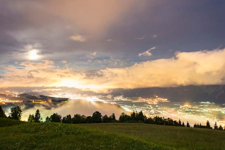 Aussicht von Holzkirche von Windegg, Tulfes, Monduntergang über Innsbruck Foto: Christophmalin.com