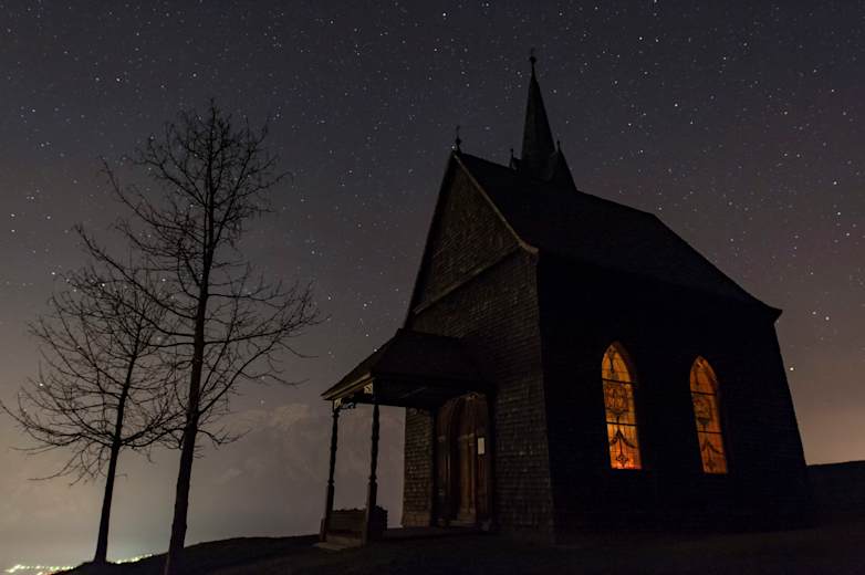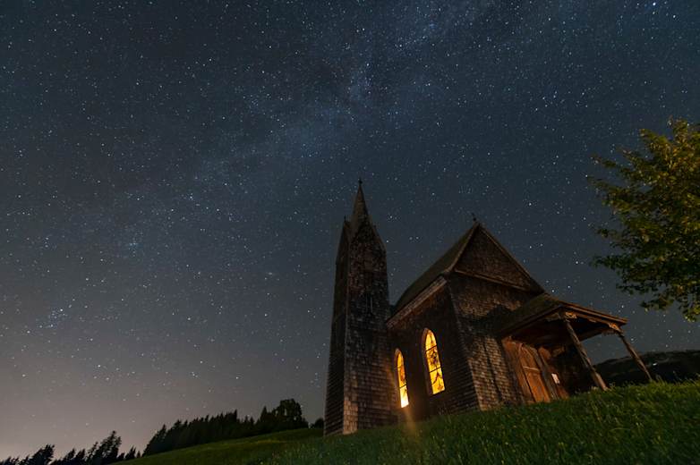Holzkirche von Windegg, Tulfes, mit Milchstrasse und Andromeda Foto: Christophmalin.com