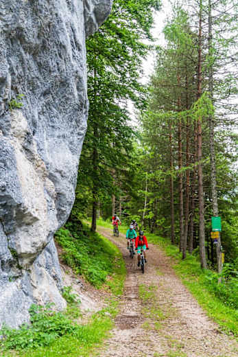 Nun fährt man auf der Straße bergauf, vorbei an der Seitenalm und folgt der Straße bis Km 8,5 zum Tourismusverband Forstau. Es geht weiter in Richtung Eibenbergwald. An der Kreuzung bei Km 9,2 orientiert man sich nach links. An den nächsten zwei Weggabelungen jeweils rechts fahren.