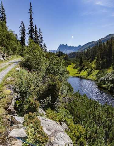 Weiter fährt man gemütlich zum Vorsäß Boden und zur Bergkristallhütte (1.250 m). Alternativ kann man bei der Bergkristallhütte den Weg in Richtung Talende bis zur Annalpe auf ca. 1.680 m fahren. Die Rückfahrt erfolgt wie die Hinfahrt.