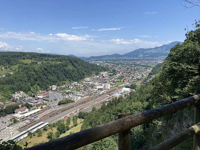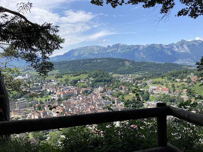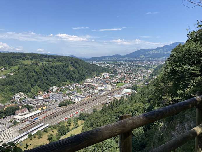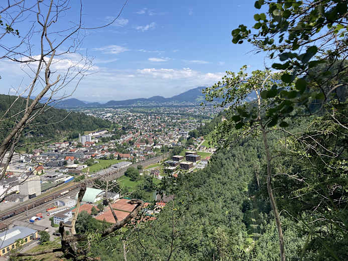 Diese wunderschöne Rundtour bietet herrliche Blicke von oben auf Feldkirch. Sie startet am Fußballplatz Altenstadt und führt erst Richtung Rankweil. Nach der Autobahnunterführung zweigt man nach rechts und fährt durch die Bahnunterführung, danach gleich wieder scharf rechts. Der Weg führt jetzt nach Schloss Amberg. Nach 30 Metern biegt man nach links ab, behält dann stets die Richtung zum Schloss bei. Dort angekommen, nimmt man den Weg nach links Richtung Göfis bzw. Hoher Sattel, man zweigt nochmal nach links auf den steileren Weg ab. Bald mündet der Weg in eine flachere Strecke (rechts), die allerdings bald sehr steil wird. Hier fahren nur mehr die konditionsstarken Biker. Es folgt ein kurzes Schiebestück, danach hat man den höchsten Punkt der Tour erreicht, wonach es einer leichten Linkskurve entlang bergab geht, bis der Weg in die Hofnerstraße mündet, der man nach links bis Feldkirch folgt. Beim Rösselpark fährt man links auf dem Radweg Richtung Frastanz durch die Felsenauschlucht. Danach biegt man rechts in die Fellengattner Straße, nach etwa 120 Metern nach rechts und der Mariagrünerstraße bis zur Abzweigung zum Stadtschrofen folgen. Der ca. 15-minütige Fußmarsch dorthin lohnt sich auf jeden Fall, hier kann man den schönsten Blick auf die Altstadt Feldkirchs genießen.
