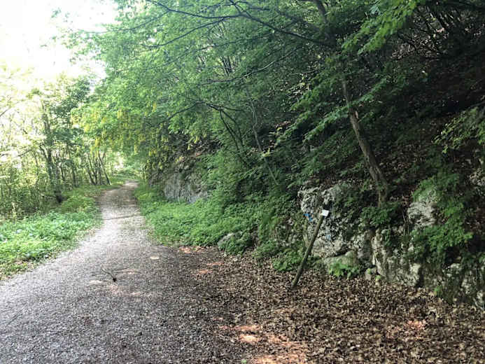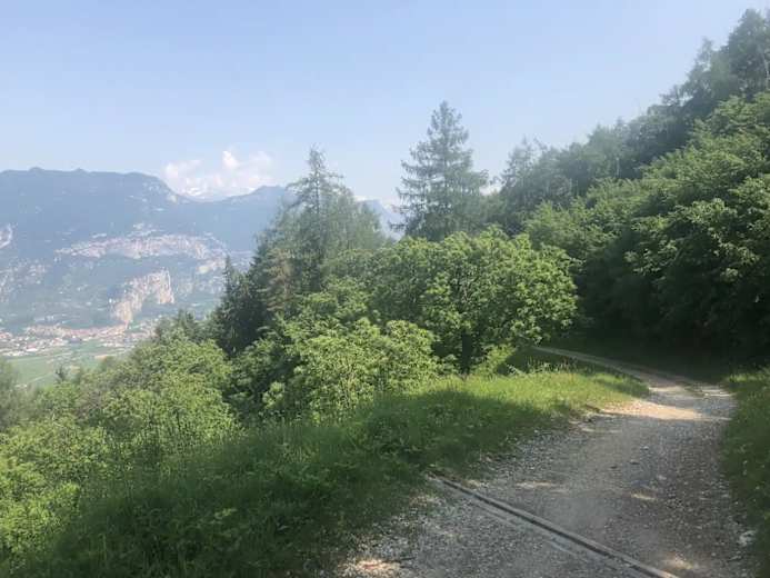 Auf der ursprünglichen Strecke geht es nun durch den Wald bergab in Richtung Carobbi. Wir halten uns dabei immer links, bis zu einer Spitzkehre hinter einer Schranke. Von dort geht es mit einer kurzen Zwischensteigung südwärts zurück in Richtung Arco. Hinter Carobbi wechselt der Untergrund auf Asphalt und teilweise auf Kopfsteinpflaster. Gemütliches Ausrollen ist angesagt. Es geht durch die Kastanienwälder bei Troiana bevor es oberhalb von San Martino an den Kletterfelsen des Vastre vorbei ins Tal geht.