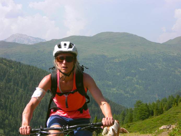 Ohne lange Wartezeiten geht es jetzt auf dem fahrtechnisch einfacheren Trail am Telfer Berg durchs Hohe Moos bergab nach Telfes im Stubai. Barbaras Schramme am Oberarm ist nicht die Folge eines Sturzes, sondern eine kurze Unachtsamkeit. Sie übersieht einen Ast, der ihr unausweichlich am Trail eine schmerzhafte Schürfwunde zuführt. Weil wir keine Zeit verlieren dürfen, stoppt ein Schnellverband die Blutung. Der schmale Leitensteig bergab zum Ruetzbach führt großteils im Schwierigkeitsgrad S2/G2 und S3/G3 permanent bergab. Die kurze steile Rampe bergauf nach Mieders zur Serlesbahn umfahren wir auf der flacheren Asphaltstraße