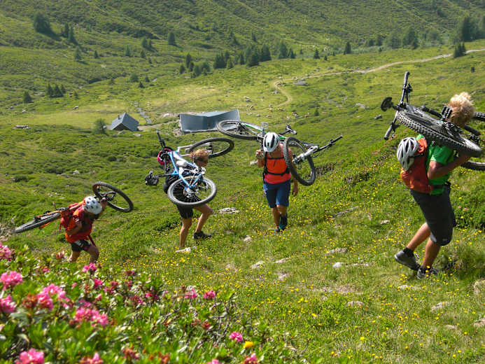Der fahrtechnische Schwierigkeitsgrad liegt abgesehen von wenigen S3/G1- Passagen und einer S4/G2-Sektion großteils bei S2/G1. Bei der Kastnerbergalm geht es weiter auf einer flachen Forststraße Richtung Nösslachhütte und nach 1,3 km führt rechts der Lärchensteig im Schwierigkeitsgrad S2/G2 bergab nach Obernberg am Brenner. Der Blick auf die Uhr im Obernbergtal – das Ziel Brenner rechtzeitig zu erreichen – gibt endlich Gewissheit, deshalb beschließen wir, vor der letzten, längsten und schwersten Etappe in Almi’s Berghotel einzukehren.