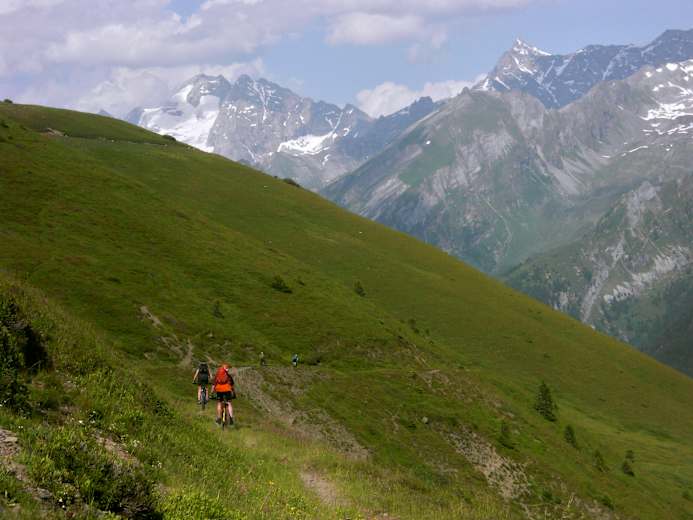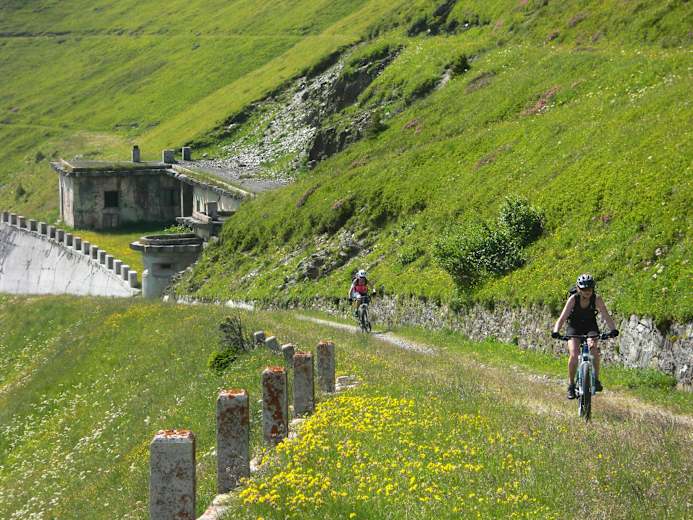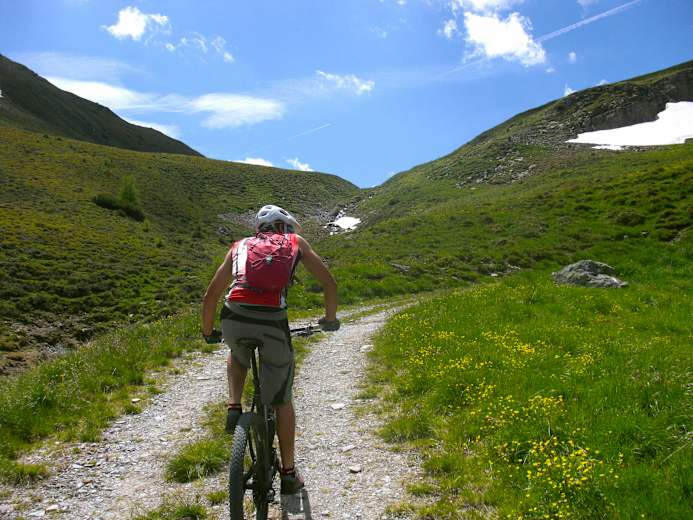 Die Forststraße im Fradertal endet 150 Hm unterhalb der Brenner-Grenzkammstraße beim Frader Hochleger. Die letzten 250 Hm bis zum Hochleger sind sehr steil und mit einem Einfach-Antrieb zu diesem Zeitpunkt der Tour schwer zu bewältigen. Vielleicht fühlt sich deshalb der steile Fußmarsch bergauf zum Flachjoch leichter an, als er ist. Nach 20 Minuten Fußmarsch ist nur noch eine kurze Bergfahrt entlang der Brenner Grenzkammstraße, die bei der Wechselalm unterhalb vom Passo del Cambio (Wechseljoch) beginnt, zu bewältigen.