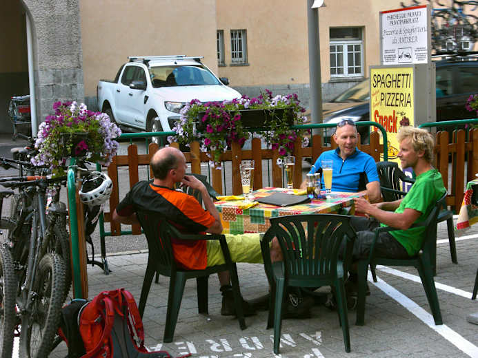 Der steinige Single Trail ST1 von der Steinalm bergab zum Brenner führt großteils im Schwierigkeitsgrad S3/G2. Die steile Rundholztreppe zum Schluss ist mit S4/G3 zu bewerten. Um 18.00 Uhr erreichen wir gemeinsam das Ziel am Brenner. Diskussionslos gibt es jetzt Pizza, Bier und Aperol Sprizz. Für die Heimfahrt entlang der Brenner Bundesstraße B181 ist es immer noch lang genug hell. Bis Steinach am Brenner geht es ohnehin bergab und auf den Flachpassagen sorgt der Südwind dafür, dass wir Innsbruck früher erreichen als geplant. Am Ende zeigt der Tacho eine stolze dreistellige Kilometerzahl an.