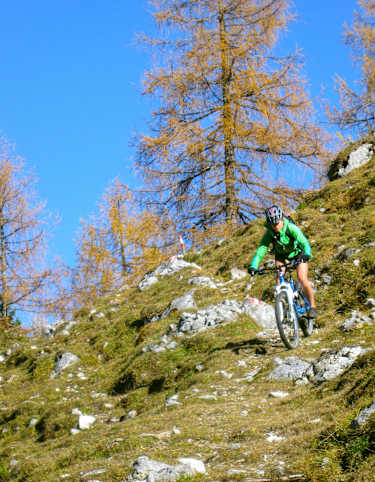 Wer die Tour „Drei-Seen-Hütte" verlängern will, fährt ab dem Gasthof Mareil rechts auf dem steilen Karrenweg weiter zum Strommast und biegt oberhalb des Gasthof Marlstein im spitzen Winkel rechts bergauf in die Forststraße zum Grünwaslkreuz ein. Beim Grünwaslkreuz bergab über die Feldringalm zum Sattele. Abgesehen von einer hohen Felsstufe, die mit S4/G3 zu bewerten ist, führt der Single Trail vom Grünwaslkreuz bis zur Feldringalm maxi- mal im Schwierigkeitsgrad S2/G2.