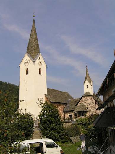 Wenn man die Pfalzkirche in Karnburg besichtigen möchte, fährt man ca. 300 m in den Ort Karburg und lässt das Rad am Beginn des Kreuzweges stehen. Von dort geht man ca. 15 Minuten zu Fuß hinauf zur Kirche. Der Blick von oben umfasst das Zollfeld und den Maria Saaler Dom. Wer hier etwas essen möchte, kann im Gasthof Moser einkehren, der einen schattigen Gastgarten hat.