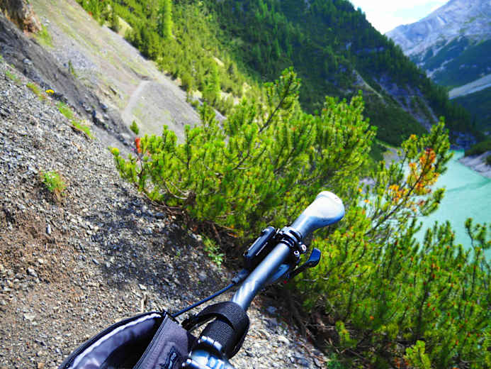 Man folgt dem Weg nach der Alp Mora noch ein Stück geradeaus und biegt dann in einer scharfen Kurve nach rechts in einen Trail ein. Nun führt ein wunderschöner und einfach zu fahrender Trail ental des Val Mora Richtung Passo Val Mora, angeschrieben ist immer der See Lago die San Giacomo die Fraele. Hier am linken Seeufer bis zur Staumauer, diese überqueren und entlang des Lago die Cancano zurück.