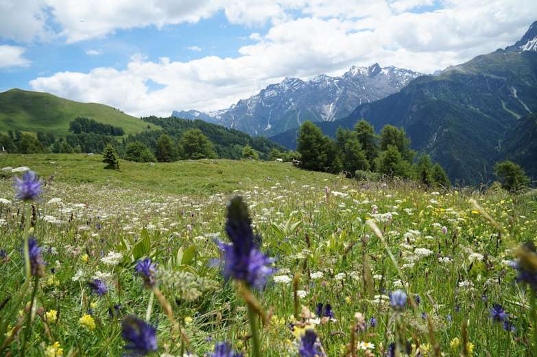 Belohnt wird man mit artenreichen, farbigen Blumenwiesen und einem riesigen Ausblick über Ardez und Guarda auf die gegenüberliegenden Unterengadiner Dolomiten.
