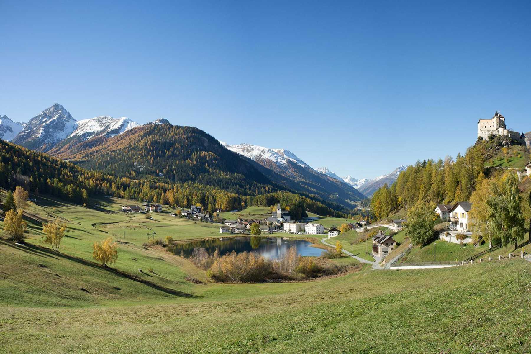 Das Schloss Tarasp thront über dem Dorf. Foto: Dominik Täuber, Tourismus Engadin Scuol Samnaun Val Müstair AG