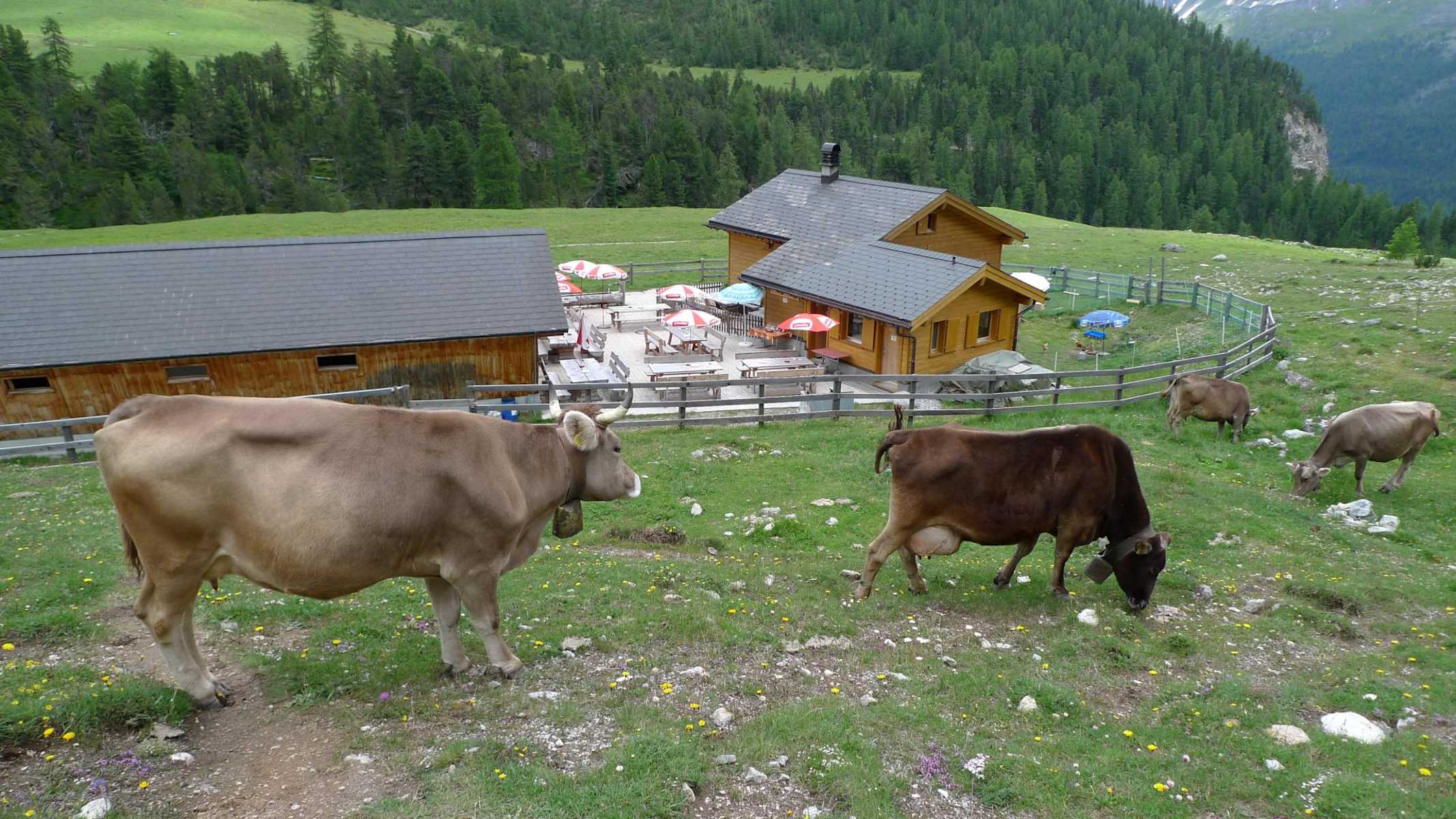 Unter dem Motto „Das kleine Paradies - im Sommer wie im Winter“ lädt die bewirtschaftete Hütte Alp Champatsch auf 2.087 m zu einer Rast ein. In der Sonne sitzend wird man mit feinsten Schweizer Köstlichkeiten verwöhnt und geniest einen herrlichen Ausblick auf die Graubündner Bergwelt.