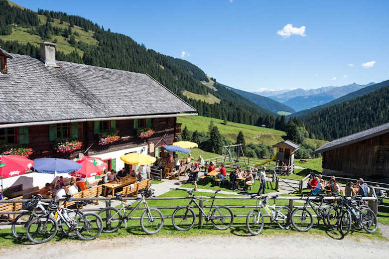 Wunderbare Mountainbike-Tour im Herzen der Ferienregion Nationalpark Hohe Tauern in Salzburg. Diese schöne Strecke führt die Biker, ausgehend von Bramberg, in das Almengebiet des Mühlbachtales wo am Tourenziel eine urige Hütte zum Einkehren einlädt. Von hier aus hat man einen fantastischen Ausblick auf die umliegende Bergwelt der Wildkogel-Arena.