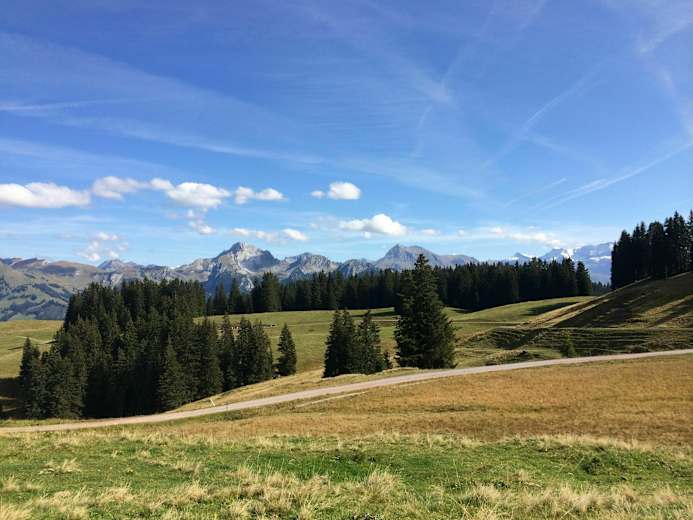 Leichte Mountainbiketour im Berner Oberland von Zweisimmen zur imposanten Moorlandschaft des Sparenmoos mit Blick auf die Berner Alpen, das Simmental und das Saanenland. Auch geeignet als E-Bike Tour.