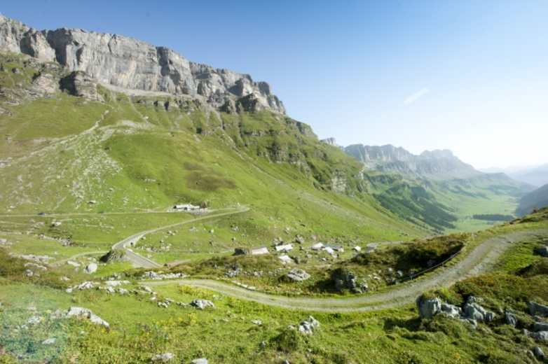 Eine feine Abfahrt auf einem natürlichen Weg über die Alp Gemsfairenhüttli (1.947 m) absolviert, erreicht man die Fahrstraße zur Vorder Chlus (1.690 m). Von dort geht es unterhalb der majestätischen Felsflanken auf der Passstraße nächste 250 Hm auf die Passhöhe mit einem Restaurant.