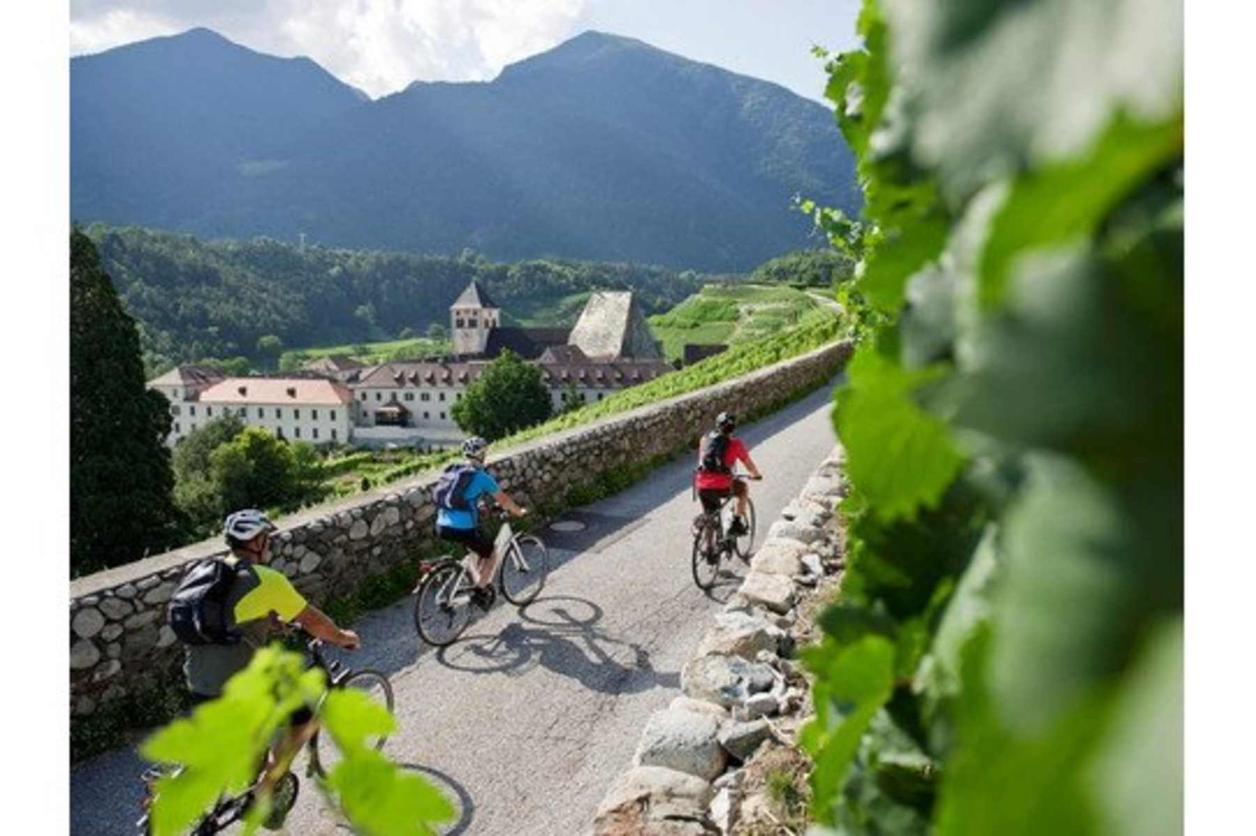 Nach einem Mittagessen geht es gut gestärkt zum zweiten größeren Teilstück der Route. Es führt vorbei an Klausen, dem malerischen Künstlerstädtchen, über dem herrschaftlich das Kloster Säben thront, durch die Talenge des Eisacktals entlang steiler Weinhänge, idyllischer Bauernhöfe und Kastanienhaine in Richtung Landeshauptstadt Bozen. Bei einem erfrischenden Aperitif lässt es sich auf dem Waltherplatz wunderbar entspannen und das Panorama genießen.