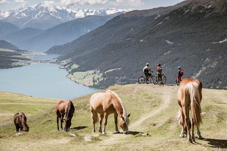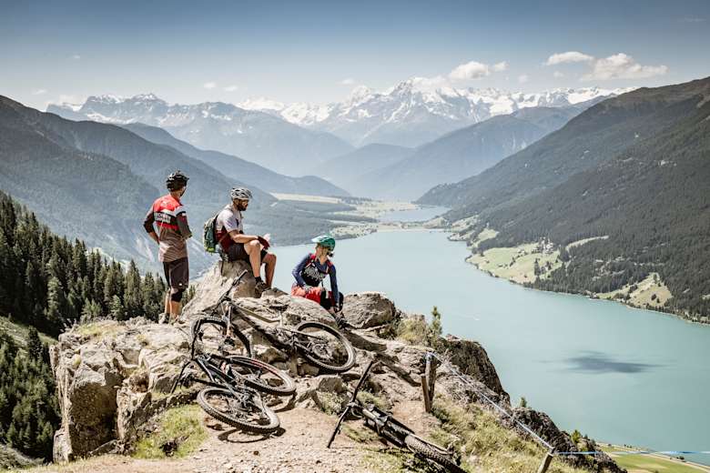 Grenzenloses Abfahrtsvergnügen bietet der 3-Länder Enduro Trail in der Ferienregion Reschenpass im Grenzgebiet Österreich, Italien und Schweiz. Vorbei an den beiden idyllischen Bergseen Grünsee und Schwarzsee, führt die Mountainbike-Route in der Sesvenna Gruppe von flowig bis technisch anspruchsvoll von Reschen via Reschner Alm über die Grenze bis nach Nauders.
