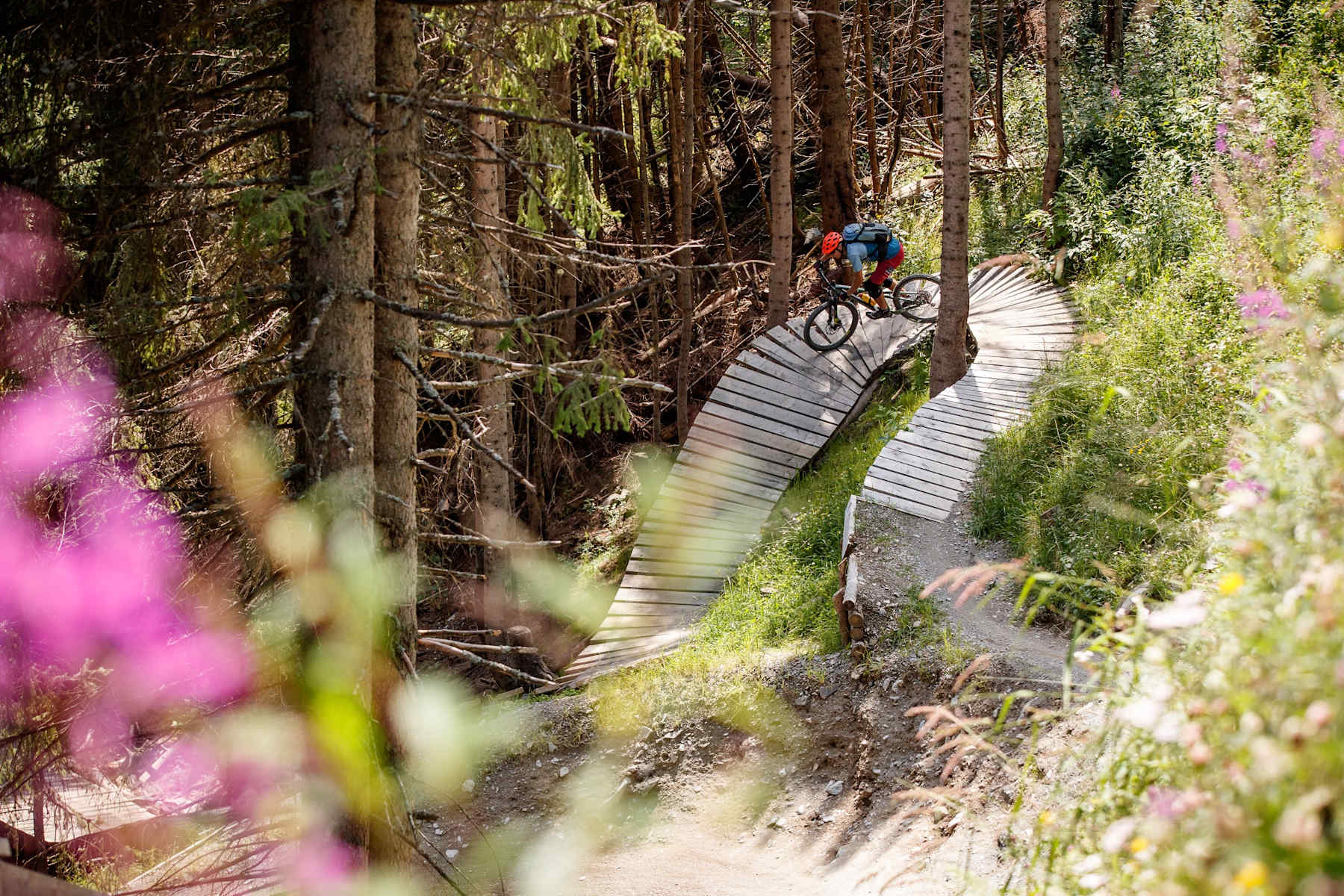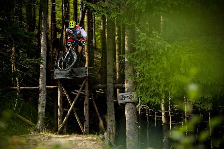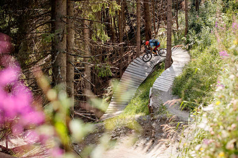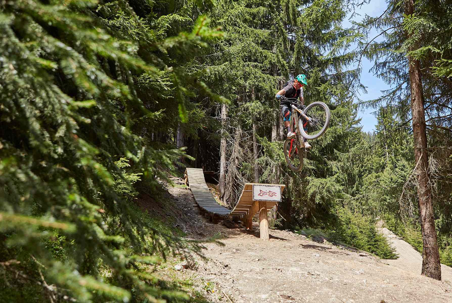 Der Evil Eye Trail an der Reiterkogelbahn in Saalbach Hinterglemm in Salzburg ist in der Tat nur etwas für absolute Profils. Aufwendig gebaut, bietet er alles, was das Herz echter Bike-Technicker höher schlagen lässt: Rampen, Brücken und Northshore-Leitern mit knapp 80 cm Breite.