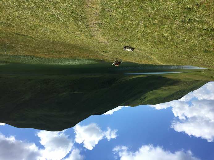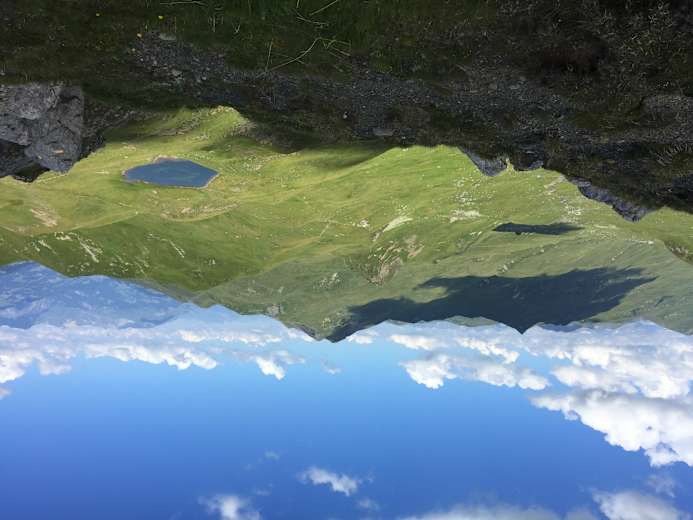 Auf etwa 2.330 m hält man sich bei der Weggabelung links Richtung Casannapass. In sanftem Auf und Ab schlängelt sich der Pfad nun über grüne Alpwiesen. Vorbei an der östlichen Flanke des Seehorns führt der Trail, jetzt etwas technischer, hinab zum idyllischen Grüensee (2.110 m).