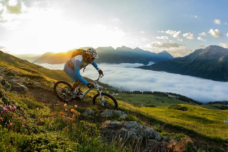 Mountainbiker bei Sonnenaufgang auf dem Flow Trail auf der Corviglia Foto: swiss-image.ch - Markus Greber