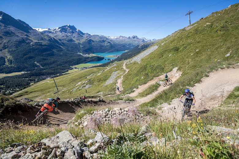 Mountainbiker auf dem WM Flow Trail auf der Corviglia mit eindruecklichem Panorama, im Hintergrund scheint der tuerkisblaue Silvaplanersee zum Greifen nah Foto: swiss-image.ch - Markus Greber Bildergalerie (4)