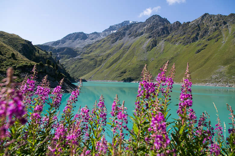 Auf 2.186 m und inmitten der Walliser Alpen liegt der türkisfarbene Stausee mit Ausblick auf den gesamten Talboden. Ein beliebtes Ausflugsziel und ein Anblick, der die Mühen des Anstiegs auf dieser Mountainbiketour im Wallis allemal lohnt.