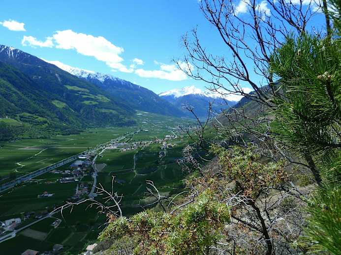Bei der Auffahrt öffnet sich immer wieder ein prächtiger Ausblick auf die Gletscher der Ortlergruppe im Talschluss des Martelltals. Nach einer erholsamen Einkehr in St. Martin im Kofel, beginnen die Flowtrails, die zu Beginn recht ausgesetzt verlaufen (Vorsicht!). Bis zum verfallenen Zuckbichl Hof verliert die Strecke kaum an Höhe. Ab Patsch beginnt dann das Flow-Finale über den begeisternden 14er-Weg in Richtung Schlanders. 200 Meter oberhalb des Vinschger Hauptortes führt ein asphaltierter Weg zum Etappenziel am Schlandersberg (Übernachtungsmöglichkeiten - Urlaub am Bauernhof).