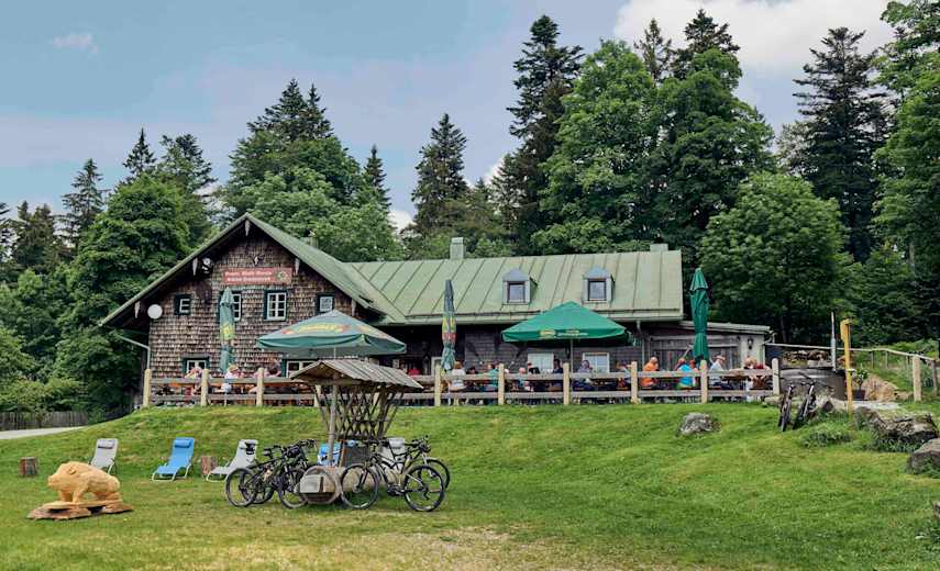 Weiter geht es immer noch sehr aussichtsreich zur Berghütte Schareben, wo man ebenfalls einkehren kann. Weiter der Markierung Nr. 44 folgend, folgt die lange Abfahrt hinunter nach Arnbruck.