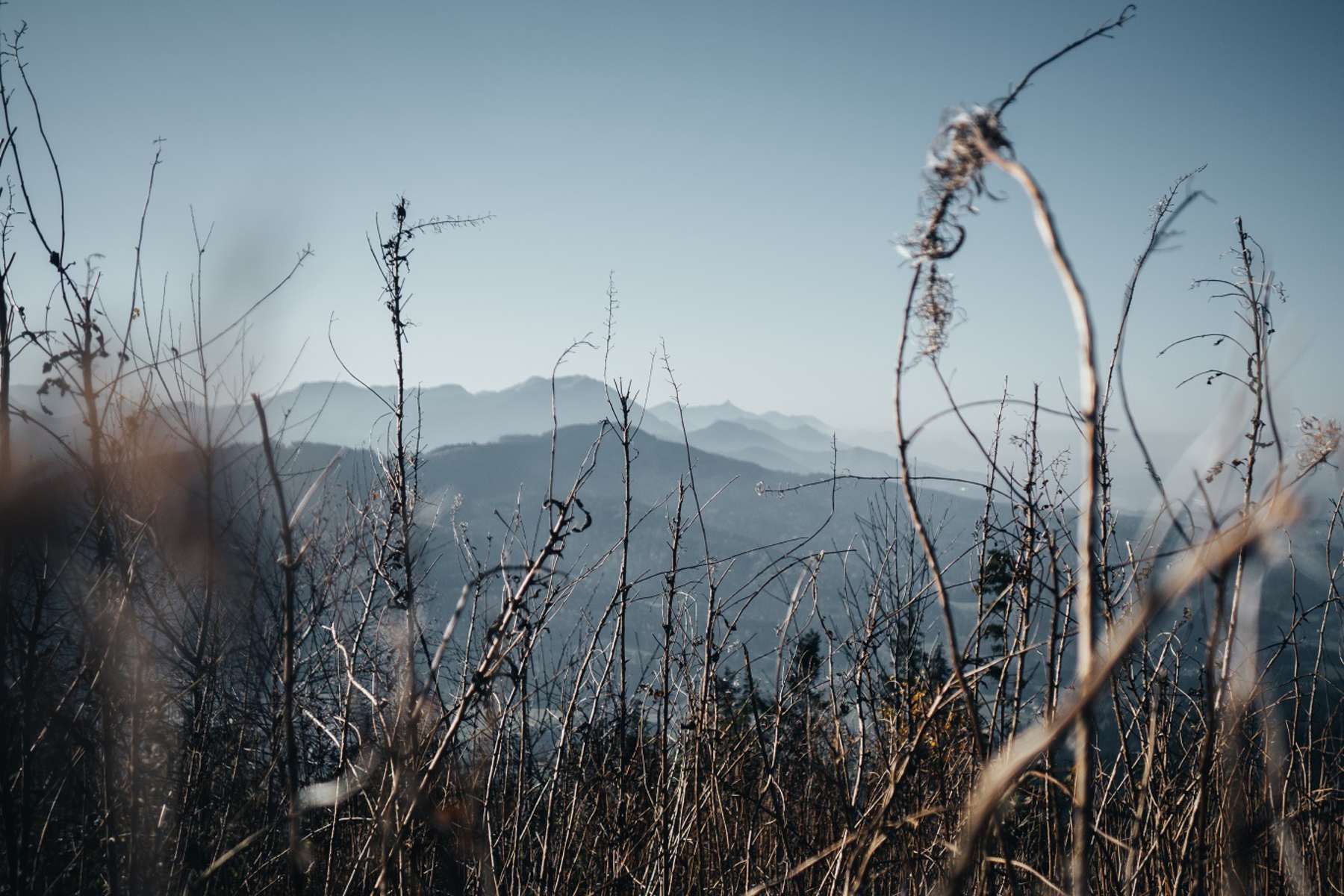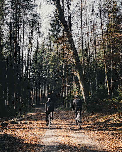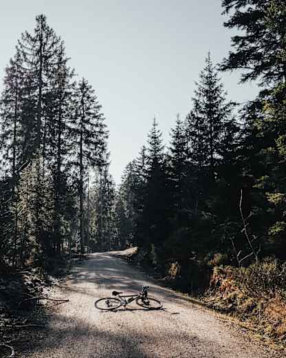 Die Route quert zunächst eine Hauptstraße und anschließend einen Bahnübergang. Danach geht es auch erstmals merklich bergauf und nachdem man den nächstgelegenen Bauernhof passiert und den Kuhfladen-Slalom gemeistert hat, setzt man den Weg in Richtung Wald fort. Man befindet sich nun am Fuße des Högls, ein von Radfahrern geliebter, dicht bewaldeter Höhenzug, welcher einen guten Mix an Schotter- und Asphaltstraßen aufweist. Wellig und in üblicher Gravel-Manier führt die Route für etwa 6,5 Kilometer um den Högl rundherum – Bergpanoramen und breite Grinser inklusive.