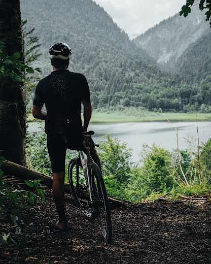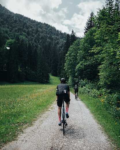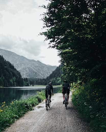 Der Weg führt an der Saalach entlang und ist landschaftlich sehr abwechslungsreich – das Höhenprofil der Strecke jedoch auch. Hat man den Ort Unterjettenberg erreicht, geht es über das linke Ufer des Saalachsees zurück bis nach Bad Reichenhall. Und auch der Mix an Schotter und Asphalt auf diesem letzten Abschnitt zeigt, dass das Gravel-Bike eine gute Wahl war.