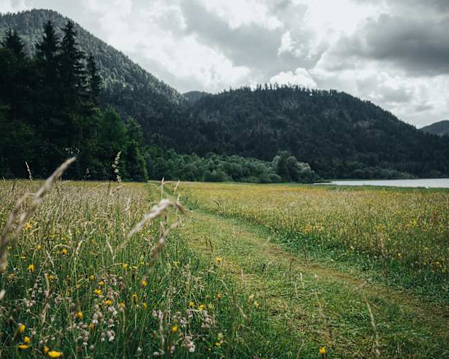 Wenige Kilometer später erreicht man schließlich drei aufeinanderfolgende Seen: Lödensee, Mittersee und Weitsee. Vor dem Weitsee quert man die Hauptstraße und biegt links auf einen Wiesenweg ab. Dieser mündet wenige Meter später in eine Schotterstraße, auf welcher man ein paar Höhenmeter sammelt.