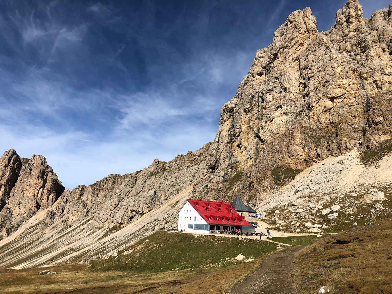 Der gleichnamige Sattel, auf dem das Schutzhaus steht, ist Knotenpunkt zahlreicher Wanderungen und daher beliebtes Ziel zwischen Schlern und Rosengarten.