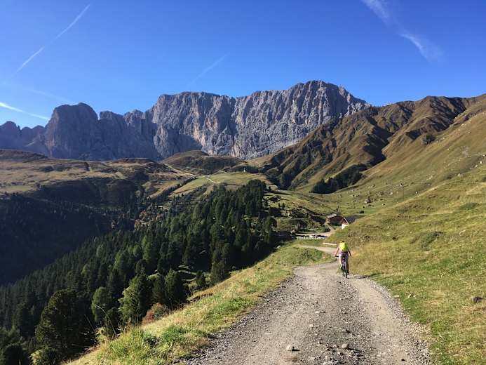 Am Tierser Alpl gibt es einen hervorragenden hausgemachten Apfelstrudel. Hier lohnt es sich, das Bike abzustellen und zu Fuß auf einem der vielen Wanderwege die Gegend zu erkunden.