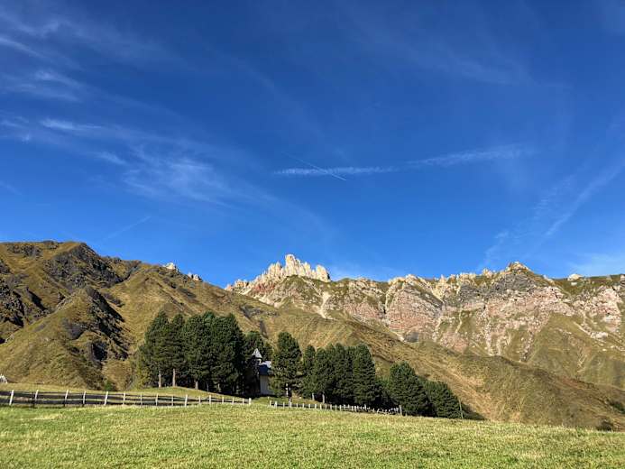 Allerhand bekannte Berggruppen sieht man auf dieser Tour: Langkofel, Plattkofel, Marmolada, Sellagruppe, Sas Rigais, Geislerspitzen, Rosszähne, Schlern mit Santnerspitze. Bei gutem Wetter reicht der Blick noch viel weiter, z. B. bis in die Zillertaler und Stubaier Alpen und bis zum Ortler!