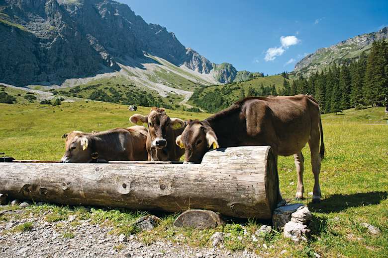 Auch das Allgäuer Braunvieh erfrischt sich an der Hinteren Entschenalpe. Foto: Stephan Baur und Sebastian Baur Bildergalerie (5)