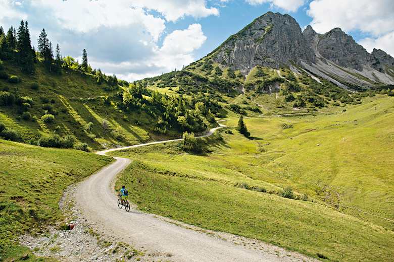 Rasant geht es auf dem bekannten Weg zurück zur Nesselwängler Ödenalpe und hier rechts ab über den sogenannten Alpenrosensteig zur Krinnenalpe. Der Blick auf Rote Flüh, Gimpel und Köllenspitze könnte kaum besser sein. Als Variante können wir von hier die direkte Abfahrt zurück zur Talstation nehmen. Wir empfehlen jedoch den Weiterweg auf dem Meraner Steig. Dabei handelt es sich um einen einfachen und sehr flowigen Singletrail, der unterhalb der Krinnenspitze am Hang entlang Richtung Osten führt. Nach dem Trailabschnitt wartet auf uns eine schnelle Abfahrt auf einem guten Forstweg hinab zum kleinen Ort Rauth. Von hier rollen wir bequem durch das Tannheimer Tal zurück zum Ausgangspunkt an der Talstation bei Nesselwängle.