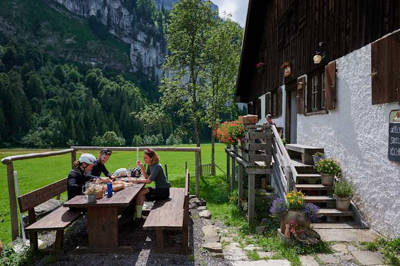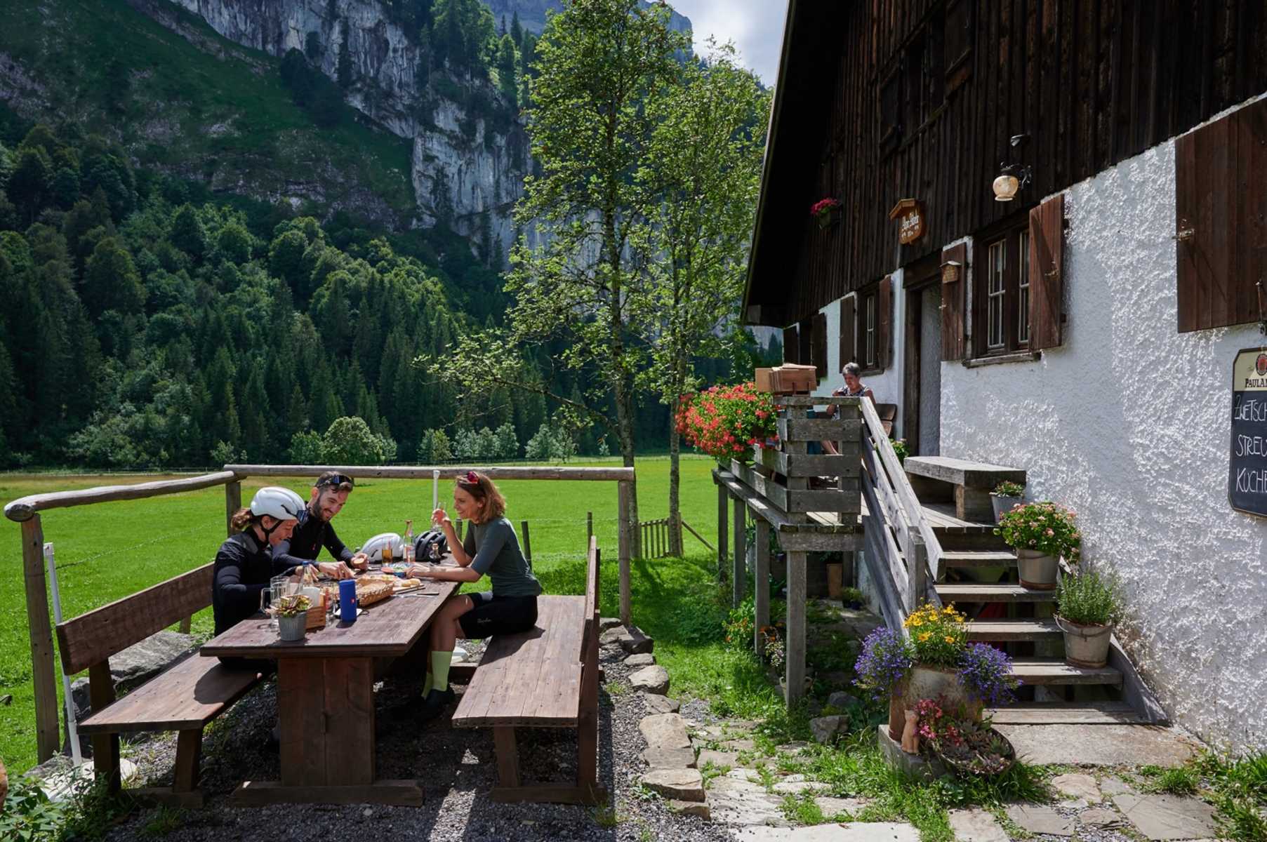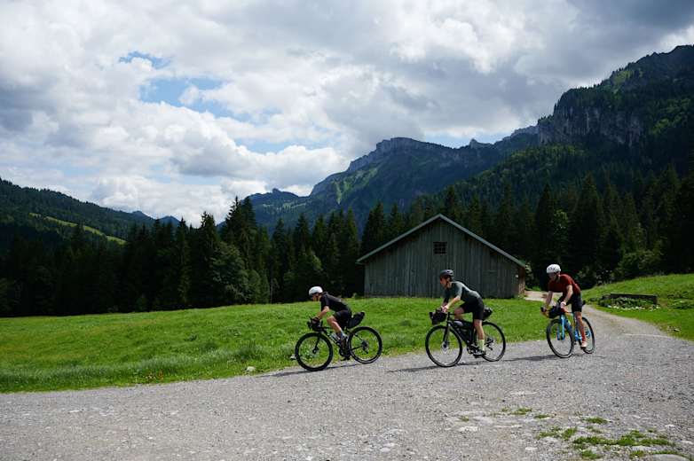 Knapp 20 Kilometer auf spaßigen Schotterwegen in grünen Wiesen und Wäldern später, erreicht man das idyllische Rohrmoostal. Nach einigen ordentlichen Steigungen auf Asphalt, bietet sich eine Einkehr in der Aibele Alpe mit Blick auf die Gottesacker-Wände an (unbedingt den hausgemachten Frischkäse probieren!) oder auch im liebevoll restaurierten Berggasthaus Rohrmoos.