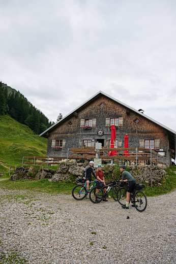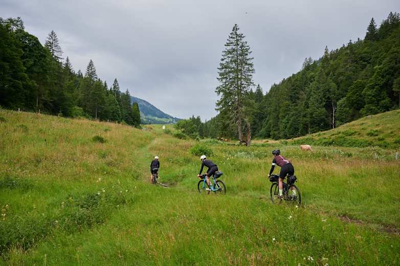Auf Fahrradwegen und ruhigen Landstraßen entfernt man sich am zweiten Tag der Bikepacking-Tour langsam von den Allgäuer Ortschaften, um wieder zurück in den Bregenzer Wald und zum Ausgangspunkt Mellau zu kommen. Dabei geht es zunächst noch gemütlich bergauf, dann warten die steilsten Anstiege der Tour. Mit Steigungen bis zu 20% wird ordentlich geschnauft, was bei der klaren Wald- und Bergluft zum Glück leichter fällt.