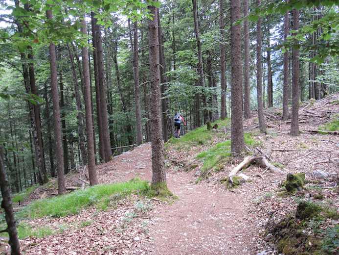 Von Ehrwald fährt man entlang der Straße in Richtung Griesen. Teilweise kann man schön neben der Straße fahren. Hier biegt man nach links ab und folgt dem Weg entlang der Grenze durch den Wald. Nach dem Passieren der Grenze erreicht man das Ostende des Sees und wenig später das Gelände bei der Musteralm.