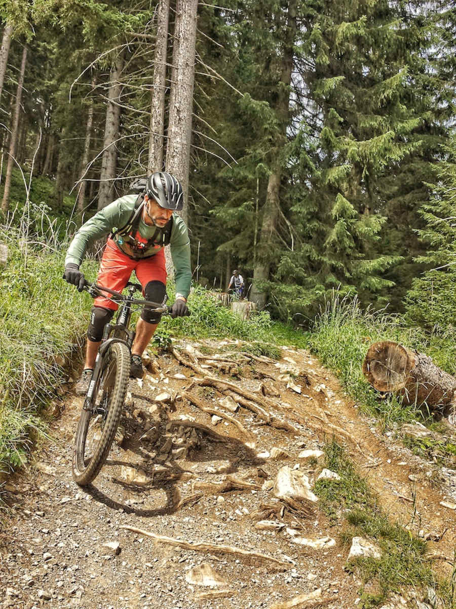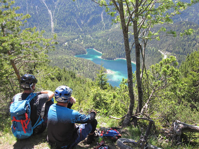 Nach der anstrengenden Auffahrt über 1000 Höhenmeter zur Grubigsteinalm genießt man eine wunderbare Aussicht auf das Zugspitzmassiv. Dann folgt der sehr anspruchsvolle Singletrail zum Blindsee, einem der drei Seen am Fernpass. Die Rückfahrt nach Lermoos ist dann wieder gemütlicher.