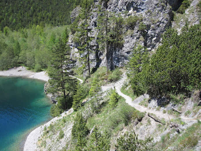 Nun braust man hinunter zur Grubigalm. Hier beginnt der technisch sehr anspruchsvolle Singletrail zum Blindsee. Der See liegt wunderschön in der Nähe des Fernpasses und lädt noch einmal zu einer Pause ein.