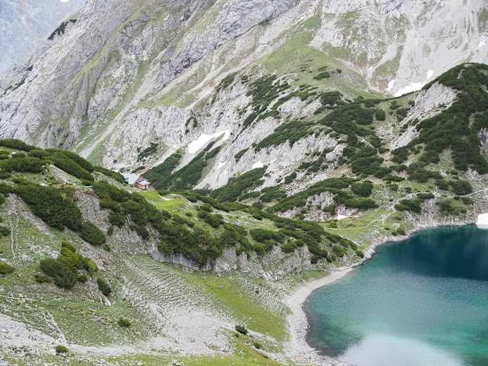 Von der Hütte aus sieht man den Seebensee und die Zugspitze (2.962 m), südlich hinter der Hütte liegt der ebenso malerische Drachensee.