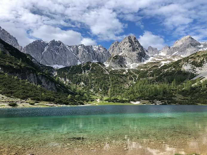 Kurz fährt man hinuntern und sieht schon die Seebenalm (1.575 m). An dieser vorbei geht es auf grobschottrigem Untergrund wieder linkshaltend bergauf zum Seebensee. Der Seebensee ist ein sehr beliebtes Ausflugsziel und Fotomotiv. Umso wichtiger ist es, diesen Platz sauber zu halten. Die Mülltonnen vor Ort unbedingt verwenden.